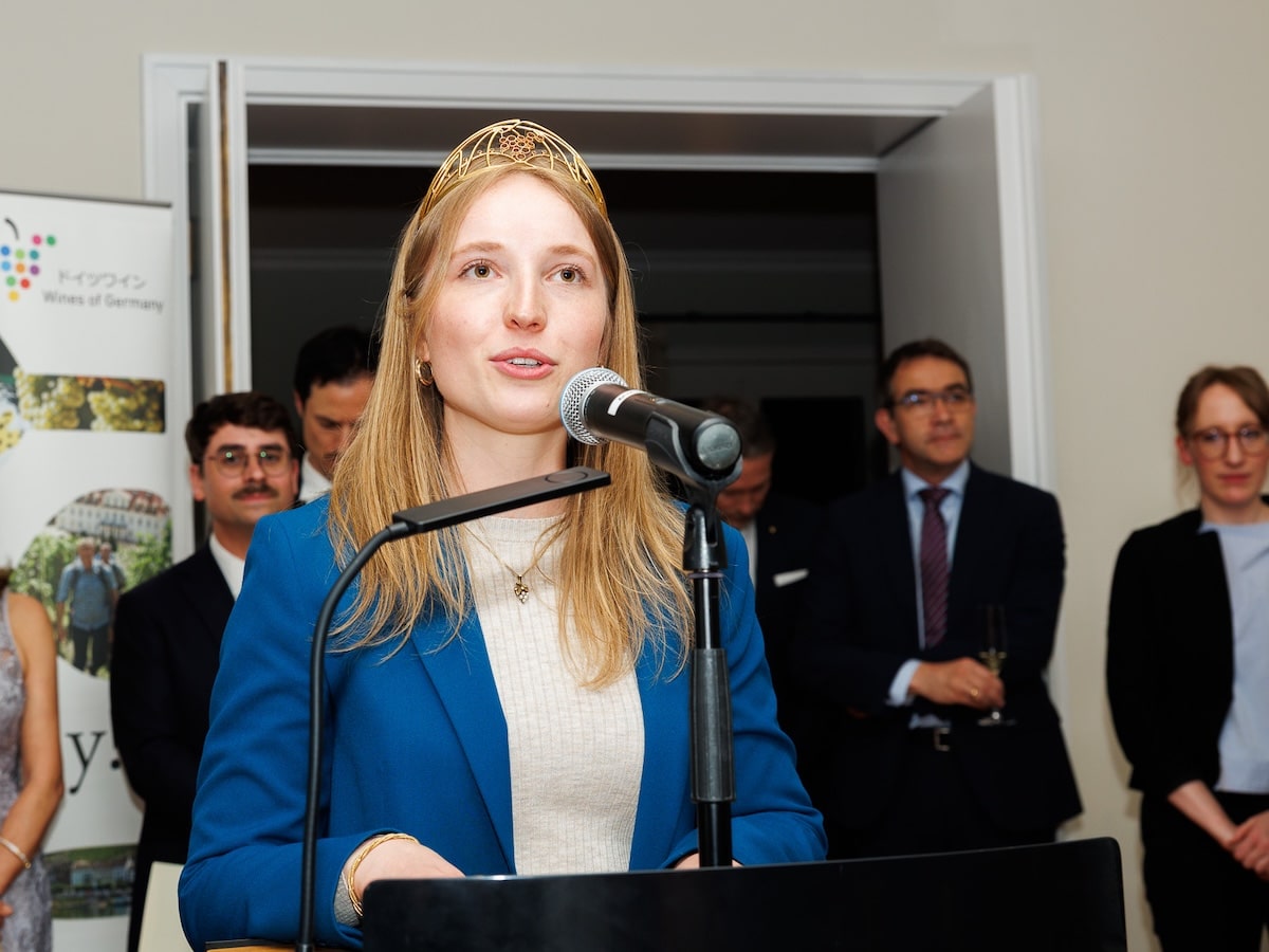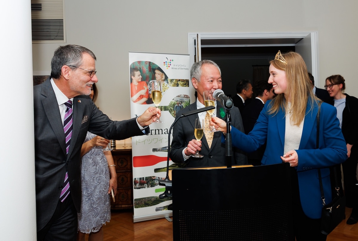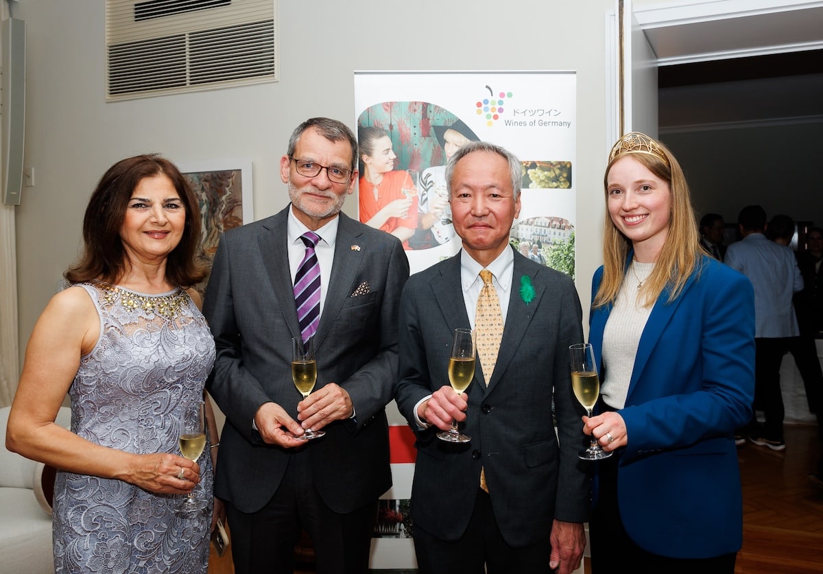 The second annual German Wine Reception — Deutsche Weinvielfalt erleben, or “Experiencing the Diversity of German Wine” — drew a full room of guests to the Ambassador’s residence, including Consumer Affairs Agency Commissioner Horii and Senior Vice Minister of Agriculture Yoichi Watanabe, who proposed the evening’s toast. The occasion was made especially memorable by the presence of Anna Zenz, the reigning German Wine Queen, who travelled from the Mosel region for the night.