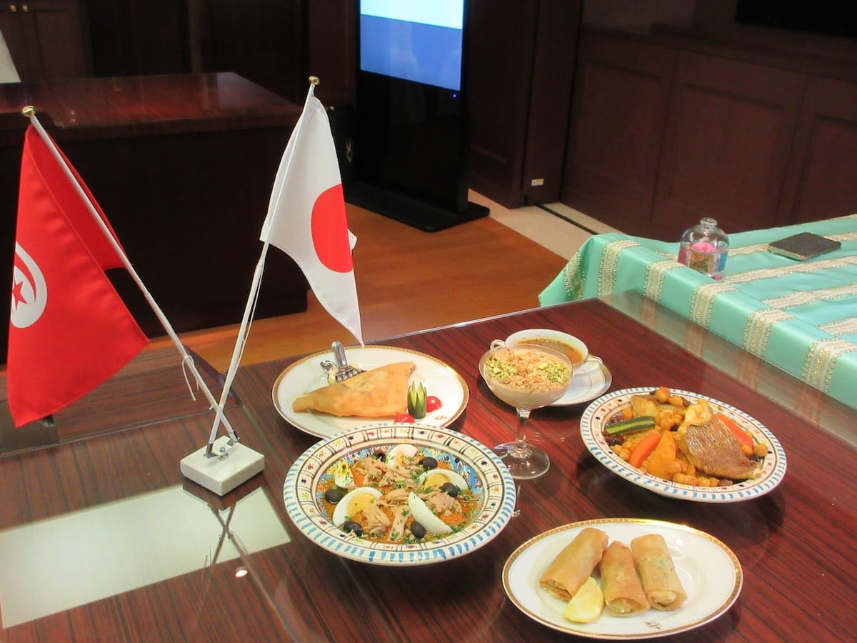 チュニジア料理を習いたいという希望は多く、それにこたえる為、このたび、シャッフラ特命全権大使のリム夫人がチュニジア料理教室を開催した。料理上手で知られるリム夫人は、日本でも手に入りやすいハリッサなどのチュニジアの調味料と、日本のスーパーマーケットで簡単に手に入る食材を使って、チュニジアの代表的なメニューを丁寧に教えて下さった。さっぱりしたスープから始まり、サラダ、揚げ物、クスクス、デザートと進んでいく料理の多彩さ、美しさとおいしさは、まさにチュニジア料理のだいご味だ。