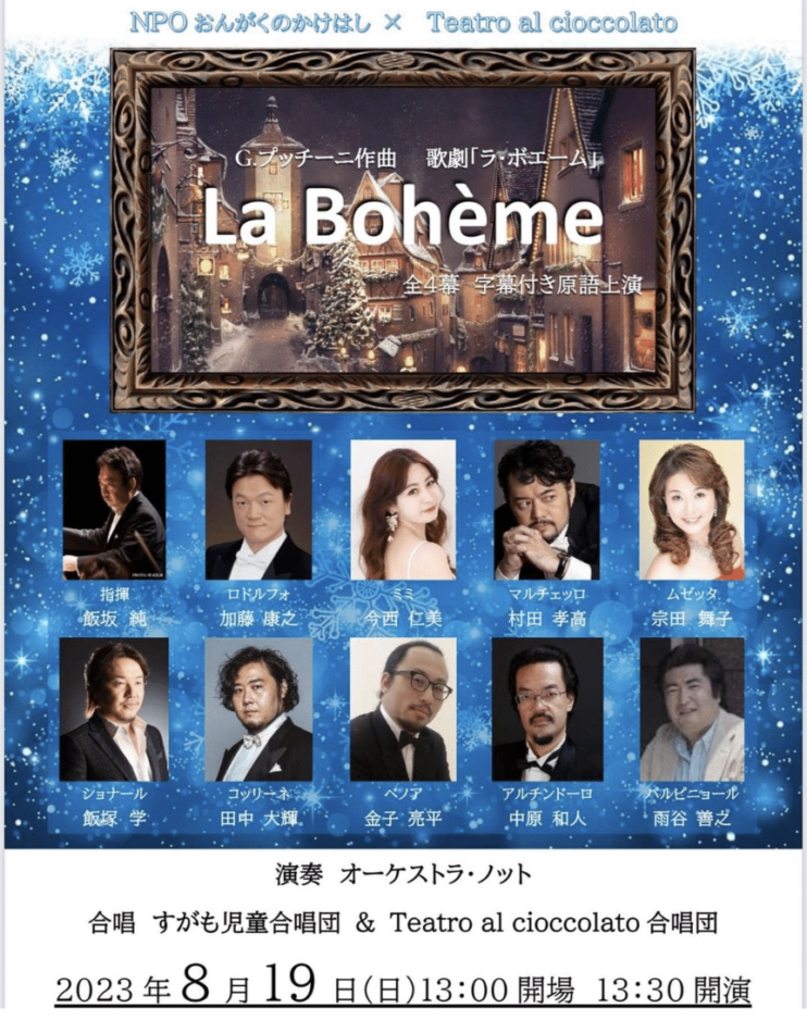 新国立劇場で副指揮者を務める飯坂純を迎え、Teatro al Cioccolateの所属のソリスト・合唱とともに、プッチーニの名作・ラ・ボエームを演奏会形式で演奏。