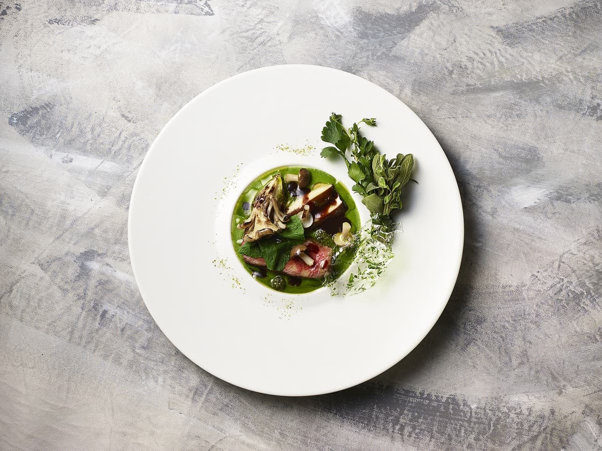 <Yokohama beef :Mushroom, Kinome and Wasabi Leaf Purée, Herb Bouquet>